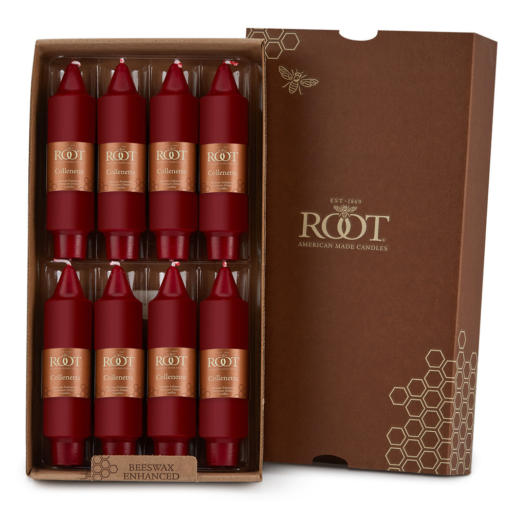 Our 5" Smooth Collenette Dinner Candle has a wide 1.25" diameter with a 7/8" tapered base to fit into any fine dinner candle holder. Root Candles' Smooth Collenettes burn an impressive 2-1/2 hours per inch. Available in three lengths; 5", 7" and 9".