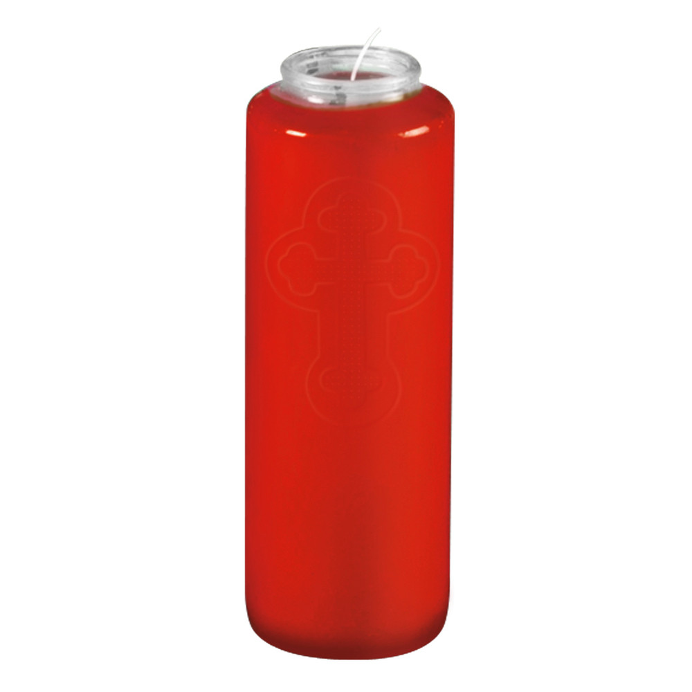 7 Day Meditation Candle in Red Glass. Restricted-Mouth Candle with embossed cross.